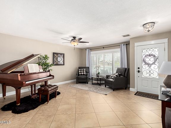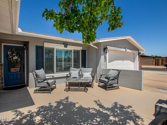 Welcome to this beautifully maintained home, thoughtfully upgraded to offer both comfort and style. The heart of the home features a modern kitchen with custom cabinetry, gleaming granite countertops and stainless steel appliances, seamlessly flowing into the inviting family room with a cozy wood burning fireplace. French door opens to a meticulously landscaped backyard, complete with a newer paver patio, turf grass, and a storage shed discreetly tucked behind the RV gate. The exterior has been upgraded with energy efficient foam insulation and Dryvit stucco. Enjoy outdoor living year-round under the covered patio., enhanced with a ceiling fan and lighting. Inside, dual pane vinyl windows and plantation shutters. Spacious primary suite boasts a custom walk-in closet, dual vanity and a beautifully tiled shower. The hall bathroom mirrors this attention to detail, featuring a granite-topped vanity and a fully tiled bathtub. Additional highlights include walk in closets in secondary bedrooms, an epoxy-coated garage floor and a prime location on a quiet cul-de-sac. Conveniently located near spring training facilities, shopping, major freeways and the airport, this exceptional home is the perfect blend of quality, comfort and convenience.
