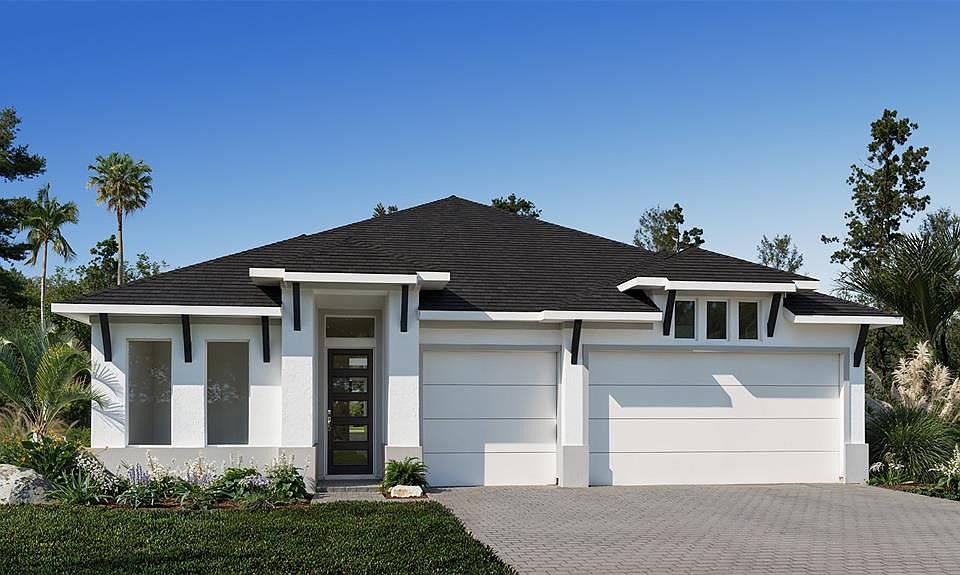 Under Construction. The front porch opens into the main entryway which is embraced by a tall tray ceiling. French doors open into the home office which overlooks the front yard. A private guest suite is down the hall and features a linen closet, full bathroom and large walk-in closet. As you enter the kitchen you are greeted by the island with built-in seating and a large corner pantry. The dining area connects the space to the family room which boasts a sliding glass door overlooking the backyard covered lanai. The primary bedroom is off the main living space and offers ample natural light from its wall of windows. Double doors lead into the bathroom which features dual vanities, a freestanding tub, linen closet, glass enclosed shower, and two walk-in closets. Two additional secondary bedrooms with ample storage complete the space. The laundry room is located off the kitchen. The drop zone leads to the three-car garage.