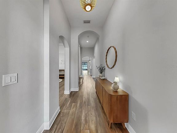 Welcome to this LUXURIOUS 4 bedroom, 2 bath home in the desirable community of Triple Creek where owners have SPARED NO EXPENSE in upgrading this home! Recent updates include lush landscaping (2025), new driveway/pavers (2024), freshly painted exterior AND interior (2025), screened-in lanai (2023), laundry room buildout (2025), BRAND NEW LVP wood-look flooring (2024), NEW blinds/shutters (2023), brand-new washer, dryer AND dishwasher (2025), EV charging station (2024) - all totaling well OVER $30k in UPGRADES! As you arrive at the home, you will be WOWED by the charming curb appeal this home offers - including fresh, tropical landscaping and an upgraded oversized paver driveway. As you enter, a welcoming foyer with arched hallways leads to the spacious first and second bedrooms located at the front of the home and a full bathroom. At the center of the home, the GOURMET kitchen impresses with its LARGE QUARTZ ISLAND and countertops, marble backsplash, chef-style range, upgraded cabinetry, stainless steel appliances, designer pendant lighting, and a full walk-in pantry. The open floor plan seamlessly connects the kitchen to the dining space and family room, where you'll find MASSIVE sliders letting natural light flood the space. Privately tucked off the grand room, the owner’s retreat offers exceptional luxury with OVERSIZED DOUBLE walk-in closets and an elegantly designed owner’s bath featuring a HUGE walk-in shower, dual sinks and a private commode. A BRAND-NEW washer and dryer, along with newly added cabinetry and shelving, enhance the functionality of the laundry room. Additional highlights include a two-car garage with an EV charging station, and a large fenced patio with a screened lanai, creating an ideal outdoor space for gatherings and relaxation. Owners have enhanced the home further with the addition of premium SOLAR PANELS, offering both exceptional energy savings and sustainability. A stylish 4-seat GOLF CART also conveys with the property, enhancing the home’s resort-style living experience. Come live the Triple Creek lifestyle, where residents have access to THREE community pools, two fitness centers, two clubhouses, basketball, tennis, volleyball courts, walking trails, social activities AND SO MUCH MORE!