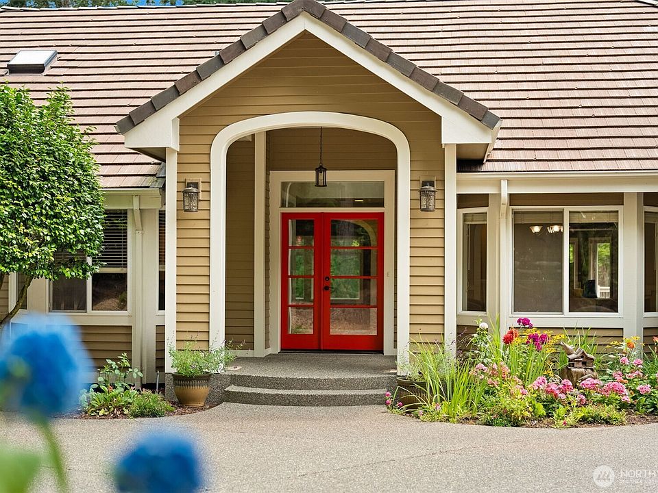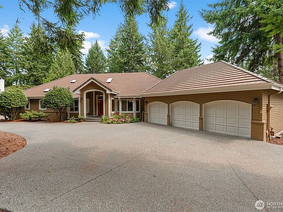 Gorgeous Canterwood golf course views from this serene & private setting on the 11th fairway. This thoughtfully designed home features main floor living, an open-concept layout, & custom built-ins throughout. The spacious kitchen includes a large island and opens to the dining area with a cozy two-sided fireplace and views. The main-level primary suite offers beautiful views of the course, a walk-in closet with convenient access to the laundry room. Washer/dryer hookups on both levels for added flexibility. The lower level includes a bonus room, three bedrooms, one Jr Suite, & former wine cellar currently used as a workshop, w/ potential to convert back. Recent updates include exterior paint (2019), heat pump (2020), and furnace (2021).