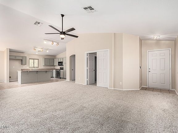 Welcome to this inviting residence! Showcasing a stone-accented facade, 2-car garage with extended driveway, and great curb appeal. Inside, the home features a spacious open layout with 4 bedrooms, 2 bathrooms, vaulted ceilings, neutral paint, and a cozy carpeted living area. A double-door den offers flexibility as a home office or 4th bedroom! The kitchen offers an island with breakfast bar, built-in appliances, ample counters, beautiful cabinetry, and track lighting. Split main bedroom ensures privacy with a walk-in closet and a bathroom. Both bathrooms are equipped with grab bars for added convenience and safety! The backyard is designed for relaxation and entertaining, featuring a covered patio, grassy area, BBQ, or gazebo. Act now!