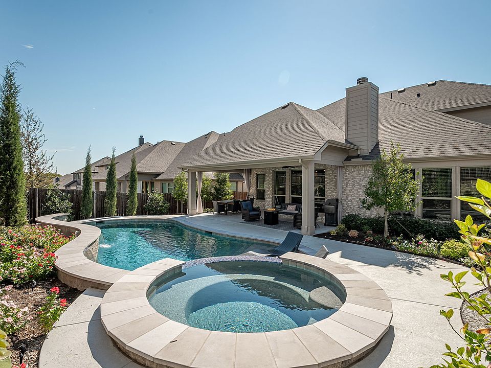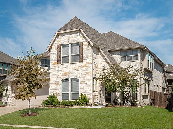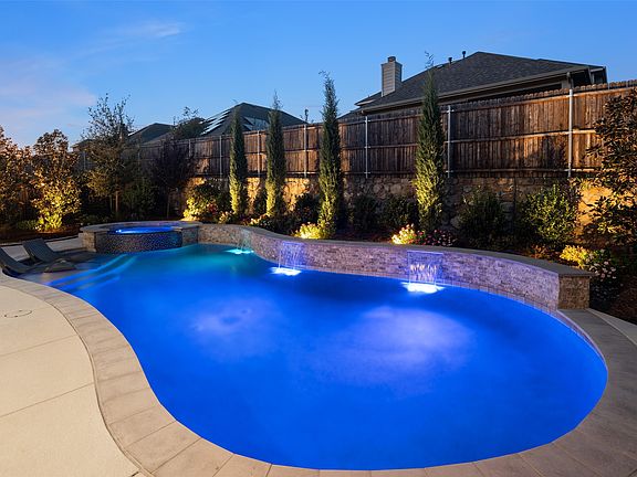 Enjoy lush greenery & a private backyard heated pool & spa in this spacious 5 bedroom home with over $200,000 of improvements in the backyard alone. From the gorgeous landscaping to the extended covered patio, the backyard oasis will create endless memories in this Anna charmer. Barely lived in & completely upgraded! The front stone elevation & gorgeous curb appeal is both inviting & grand. The epoxy walkway leading to the glass front door welcomes you inside. Hardwood flooring with a formal dining & office space are located near the front. The downstairs has both a primary & secondary bedroom or an office depending on your preference. The open kitchen space & living room is perfect for entertaining guests. Upgrades include granite counters, cabinet hardware, stainless appliances, designer lighting & a stacked stone fireplace with cedar mantel. The primary bedroom is located near the back of the home with views of the backyard pool. The primary bath is upgraded with stained cabinetry, a frameless shower & upgraded tile. Upstairs is a spacious game & media room with 3 additional bedrooms & 2 full baths. The oversized 2 car garage has plenty of storage space & the home has a water filtration system. The incredible backyard space with covered seating areas, water features, extensive landscaping create the most tranquil space for relaxation. Community amenities include playground, fishing, walking trails & the nearby Natural Springs Park.