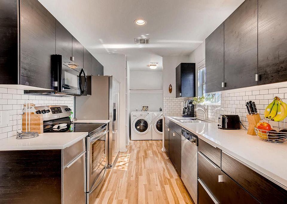 This beautifully updated 3-bedroom, 2-bath home in East Austin offers modern finishes throughout, including quartz countertops, stainless steel appliances, a stylish tile backsplash, and wood-look vinyl flooring. The open living, dining, and kitchen layout creates a bright, inviting atmosphere ideal for everyday living and entertaining. A convenient first-floor bedroom and full bath provide flexibility for guests or a home office. Upstairs, you'll find two additional bedrooms, a double-vanity bathroom, and a versatile loft. Enjoy your private, fenced yard perfect for relaxing or hosting friends. Located in the highly sought-after 78721 neighborhood with quick access to East 6th, Downtown, and major highways. Washer and dryer included!