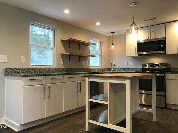 Adorable updated home with rocking chair front porch that sits on nice lot with gracious backyard. Open floor plan offers spacious living room open to kitchen with island and plenty of cabinets and counterspace. Primary bedroom has private bath and walk in closet. Accented barn door to bedroom. NO CARPET. Convenient location to popular Downtown Durham featuring DBP, DPAC, mom and pop dining and the tobacco trails. Come take a look!