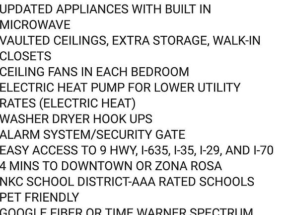 White Appliances (12a) This is a large tri -level Town home with a 2 car garage. You are surrounded by an oasis of trees and all its beauty and quiet community. We are just minutes to entertainment, dinning, Cerner, Worlds of fun, Power & Light District and the Airport. We have multiple other plans to choose from ranging from $1100 to $1500 as well to fit your families needs. CALL TODAY!