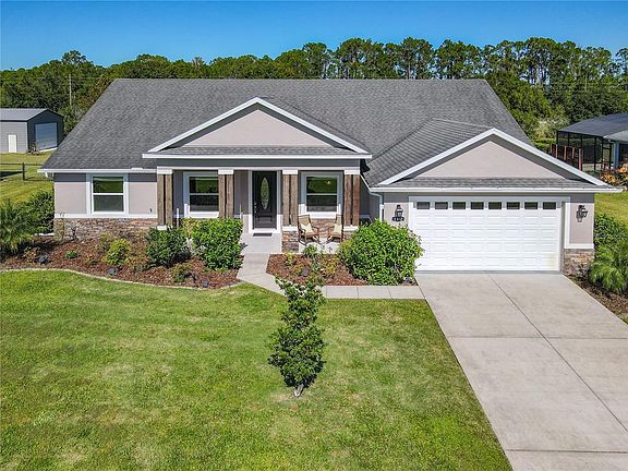 This Modern Craftsman Ranch home is sitting on a half acre of land and is just right for the pickiest buyers. Welcome home to this beautifully updated four-bedroom retreat featuring a spacious open floor plan highlighted by neutral tones, that translate into class and elegance. The expansive main area flows from the Foyer and formal Dining Room past a striking Grand piano into the comfortable Living Room. It all comes together seamlessly with this chef-inspired Mocha Kitchen with BRAND NEW stainless steel APPLIANCES (Refrigerator, Dishwasher, Stove), granite island surfaces, and a captivating, stylish mosaic glass backsplash. Step into your Primary Bedroom that offers French door access to the covered Lanai that extends the living area to an outdoor oasis. The owner has invested in a customized, electric Dropshade for the large sliding glass doors leading onto lanai, while the secondary bedrooms include a flexible space configured as a bright home office and another as a charming bunk room. Enjoy your mature backyard that includes a serene atmosphere with a firepit, raised vegetable gardens, and a countered courtyard. Need extra space? A Brand New OUTDOOR SHED installed in 2023. Other upgrades include a well water tank 2025, a water Softener in 2025. Brand NEW A/C. The layout is one of a kind; in that every area has its own bathroom. The owner's suite, the 2-bed suite, and the private princess suite behind the barn doors are perfect for overnight guests. This established, manicured community with a neighborhood pond and access to a nearby lake provides the perfect blend of style, function in St. Cloud, close to highways, schools, beaches, shopping, the airport, and set apart from the chaos of downtown living.