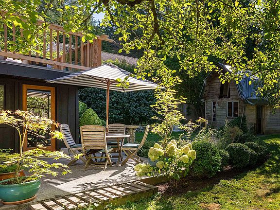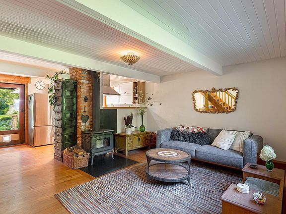 Lush gardenNew updatesVintage characterWood stoveCurated lighting fixturesMetal roofDecks and railings
