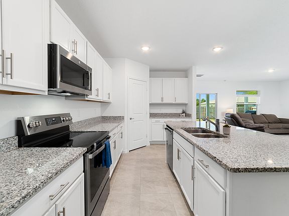 Modern white cabinetryWelcoming finishesLarge center islandLarge lanaiAbundant natural lightGranite countertop spaceNewer privacy fence