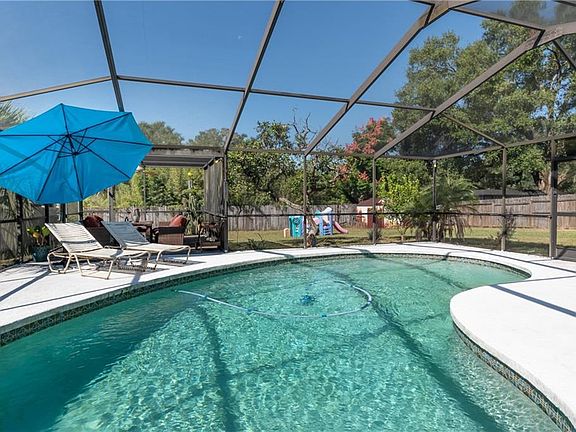 Wow! Welcome to this move in ready home on an OVERSIZED 1/4 acre lot nestled in the well-established neighborhood of Kingsway Downs! This BEAUTIFUL 4 bedroom 2 bathroom house Features an ENCLOSED POOL with 300 SQ FT wooden deck to enjoy the sunny outdoors. The large OPEN KITCHEN boasts Corian counters, Ceramic tile floors , hardwood panel cabinets & a floor to ceiling pantry with plenty of storage which opens into the formal dining room to entertain. Take a seat in the formal Living room and keep warm by the Stone wood-burning FIREPLACE. A split-room floor plan with laminate hardwood floors in all the bedrooms allows plenty of privacy for the entire family. The very best feature of this home is the expansive back yard. W/ so much space & privacy, the possibilities are endless. It is fully fenced, so you will be comfortable letting your little ones & pets roam & play. This home is centrally located & just minutes away from shopping, dining, entertainment & most major highways & interstates. And--best of all--there are no HOA fees, no CDD fees, and no deed restrictions! Welcome home!