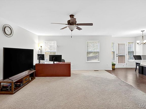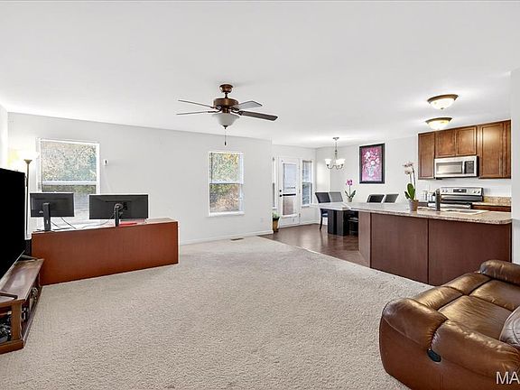 Fantastic opportunity to own this beautiful, nearly new 7-year-old, 2-story townhome featuring 2 bedrooms, 2.5 baths, a 2-car garage, and a walk-out lower level. The gorgeous kitchen boasts rich cabinetry, stainless steel appliances, a pantry, ample counter space, and a large island that opens to the bright living and dining areas — all overlooking a scenic backdrop of lush trees. The open-concept floor plan is warm and inviting, offering an abundance of natural light and effortless flow between the living, dining, and kitchen spaces — perfect for entertaining or everyday living. Upstairs, the spacious primary suite showcases elegant coffered ceilings, dual walk-in closets, and a private ensuite bath with a double vanity. A second bedroom with a walk-in closet, a full bath, and convenient upstairs laundry complete the upper level. The unfinished walk-out lower level is ready for your personal touch and includes a rough-in for a full bath and generous storage space. Enjoy low-maintenance living with an HOA that covers exterior upkeep, some insurance, trash service, and property maintenance. Brand-new roof just installed! Ideally located near Mercy South Hospital, Dierbergs, and Highways 55 & 270, offering suburban comfort with easy access to shopping, dining, and major routes.
