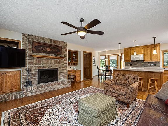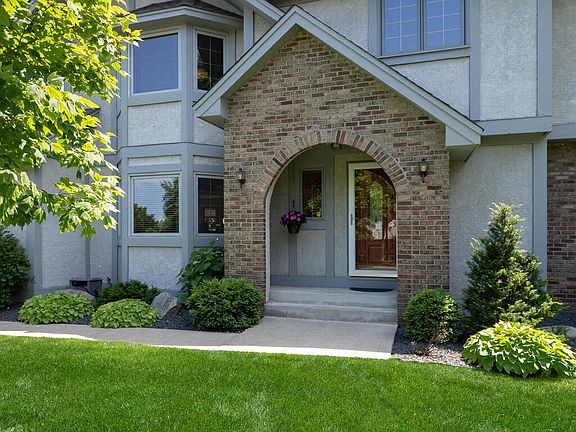 Quality custom built two story walk-out on a gorgeous landscaped lot. Stunning curb appeal feels "Chateau" w/ arched covered entry. Enter foyer w/ gleaming hardwood floors. Such a comfortable home w/ full brick wall fireplace, Lots of sunshine & natural light w/bay windows. Main floor family room & open concept kitchen overlooking great deck for entertaining. Corian counters, huge center island, built in desk. Formal living has wood surround floor w/ carpet, fireplace & integrates into vaulted 4 season sunny porch. Dining room w/French doors could be main floor office. Wide staircases & four spacious bedrooms up. Classic primary ensuite w/newer bath & walk-in closet/built-ins. Lower level walk-out w/library paneled walls & wet bar/cabinets/wine rack & new plush carpet. Lots of space including game room & 2 storage rooms. Lovely pavered walk-way outside doors. New in 2022: Furnace, air conditioning, water heater, Speed Queen washer/dryer, new front door & storm along w/dinette doors. Many new Marvin windows. Security system, sprinkler system, attic in garage w/pull down stairs, extra work area, 50 year shingles on roof, gutter guards, extra circuit #6 line for hot tub or sauna. Extra insulation in ceiling, R value 50. New Frontier fiber optic.