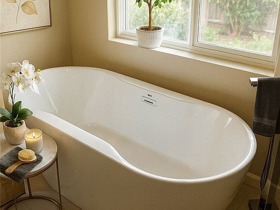 This home offers three well-sized bedrooms and three full bathrooms. The private master suite features vaulted ceilings, a large walk-in closet, and a beautifully finished bathroom complete with a freestanding soaking tub and an oversized walk-in shower. The additional bedrooms provide flexibility for family, guests, or a home office.