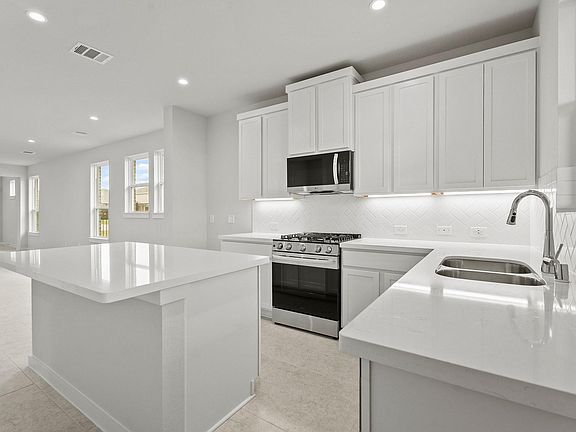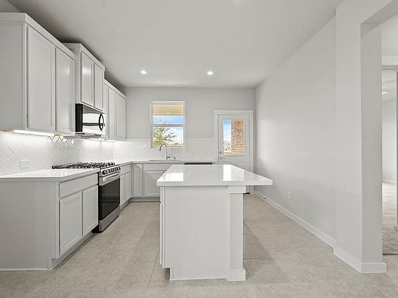 The Paisley is a 1-story new house design with 3 bedrooms and 2 full bathrooms. This floor plan features an open and central great room, a kitchen that includes an island with a serving bar, dual sinks and a large walk-in closet in the owners retreat, a walk-in utility room with easy garage access, a rear covered patio, and an attached 2-car garage.