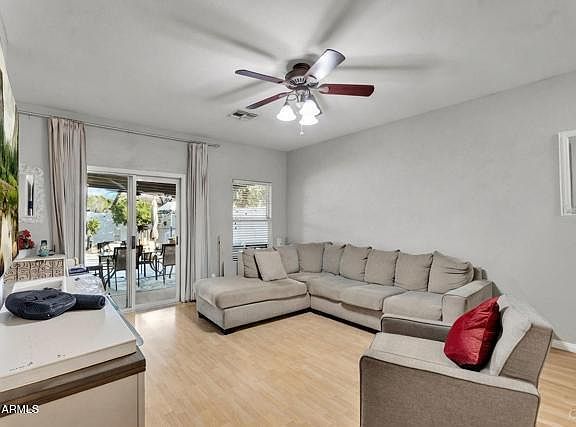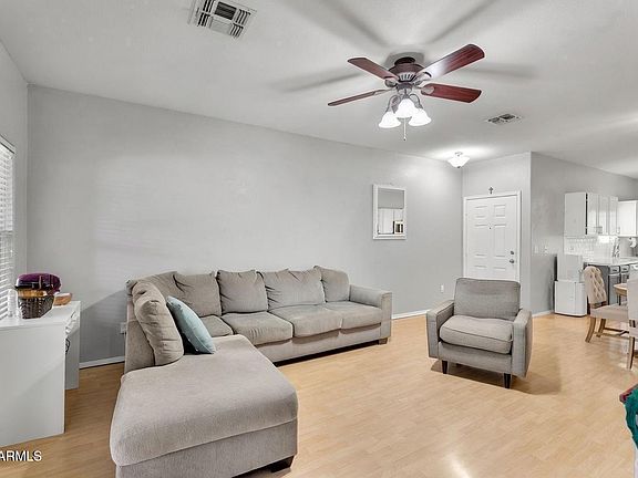 Gorgeous, well-kept home ready for you to move right in! The seller spared no expense. New quartz counters in the kitchen and baths, added patio roof, fresh pavers, and a peaceful backyard seating area perfect for Arizona days. Inside, enjoy an open floorplan with laminate flooring, modern gray tones, and a gourmet kitchen featuring stainless steel appliances, subway tile backsplash, quartz counters, pantry, and plenty of storage. The lovely primary suite offers a walk-in closet, dual vanity, and a large tub/shower combo. The backyard is built for entertaining with an oversized covered patio, concrete and paver extensions, plus a newer AC for energy-efficient comfort!