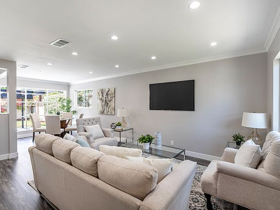 Welcome to this a fully updated dream Home with every modern convenience! Nestled in the welcoming community of Valley Glen, you'll find this fully renovated 3-bedroom/2-bathroom gem with a generous 1,080-sqft of living space. Outside, a sole tree sways gently over the custom contemporary perimeter fence. Just beyond it, you'll find a wide driveway, newly landscaped front yard with a walkway leading to a front door situated beneath a covered front porch. Open the front door to find a sweeping floorplan carrying you from room to room on currents of intuition. The living area immediately introduces you to this home's understated charm; rich laminate flooring and robust baseboard molding create an enchanting parallel to intricate crown molding and tasteful recessed lighting. A casual dining area is set alight by soft sunlight pouring in through a wealth of windows including a nearly full windowed wall that looks out upon a placid pergola begging for leafy tendrils to turn it into your private shaded retreat. The lush greenery of the backyard is matched by sentinel trees standing at attention across the secure walled perimeter. Masterfully crafted pristine white cabinetry, new stainless-steel appliances, and glossy light gray marble countertops help to bring culinary creations to life in the contemporary kitchen. A standalone bathroom offers a shower stall and separate soaking tub with some custom kaleidoscopic tiles for unmatched character. Two of the three bedrooms boast the added convenience of mirrored closet doors. The primary bedroom is further distinguished by the comforts of an en suite bathroom with chic sliding barndoor entry. The home also includes an oversized yet accommodating attached 2-car garage with washer dryer hookups.