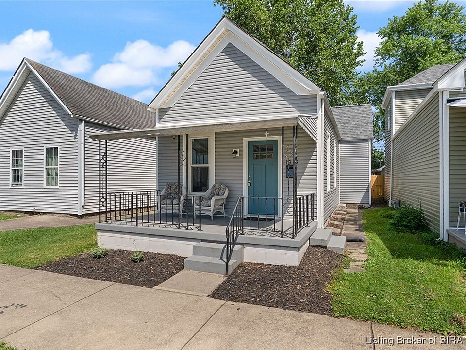 Welcome to the most charming move-in ready home in the heart of historic downtown New Albany, IN! Completely updated from top to bottom, this one is truly a showstopper. The covered front porch welcomes you into the open concept living room and kitchen, complete with a luxurious backsplash and stainless steel appliances. The primary bedroom is situated with an ensuite bathroom including tiled shower, and just down the hall is a spare bedroom, bathroom, and laundry room. Washer and dryer are included in the sale. The high ceilings, luxury vinyl plank flooring, and fresh paint throughout can't help but elevate the space. A brand new privacy fence completely surrounds the backyard, ready for all your summer activities. Other updates include roof, furnace, and AC unit (~3yrs old) and water heater (~4 yrs old). This house is just minutes away from all modern amenities, yet offers the most peaceful oasis to call home. You won't want to miss this one!