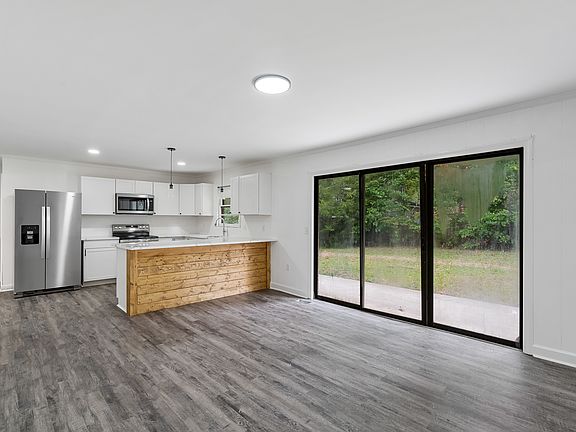 Step inside to find a brand-new kitchen boasting white shaker cabinets, quartz countertops, stainless steel appliances, and a spacious island with pendant lighting perfect for entertaining or casual meals. The open living area features new luxury vinyl plank flooring, recessed lighting, and large sliding doors that flood the space with natural light and open to the backyard.