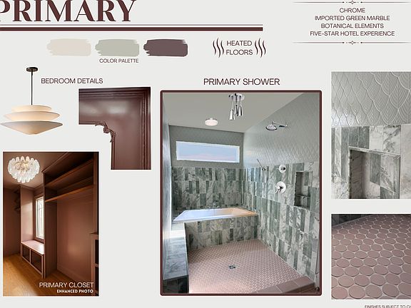 Upon reaching the upstairs landing, you'll find an open loft with custom built-ins and skylights among two additional bedrooms. Sunlight pours into the ornately-detailed primary bedroom. Its spa-like bath, inspired by a five-star hotel, showcases imported green marble and botanical tiles in perfect contrast with the blush tone of the heated floors. The glamorous closet is trimmed with oak, chic lighting, and a rich mauve paint.