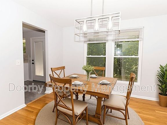 Step inside to find a spacious living room that flows into a dedicated dining area featuring a modern light fixture. The nearby kitchen is updated with sleek white cabinetry, stainless steel appliances including a refrigerator, range, microwave, and dishwasher, and a beautiful tile backsplash. You'll also enjoy easy access to the back porch directly from the kitchen.