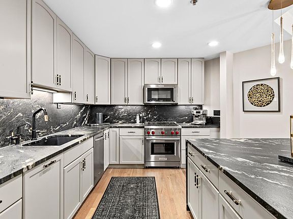 Luxury abounds in this 3rd floor unit at the prestigious Watermark in the heart of Elm Grove. With over $100K in recent updates, not a detail has been overlooked to add quality and elegance to every corner. Fully equipped kitchen with every feature considered for convenience including high end appliances, instant hot water, leathered granite, and custom lighting. Open to the Living and Dining Rooms w/beautiful stained cherry wood floors and a jaw-dropping floor to ceiling marble tiled fireplace. 2 spa-like full en suite baths w/option to use either bedroom as Primary Suite. Balcony overlooks courtyard and fountain w/custom retractable screen door and electric awning for maximum enjoyment. 2 spaces in heated underground parking plus storage unit. Active HOA w/socials and community room.