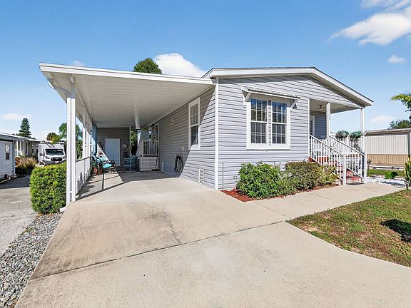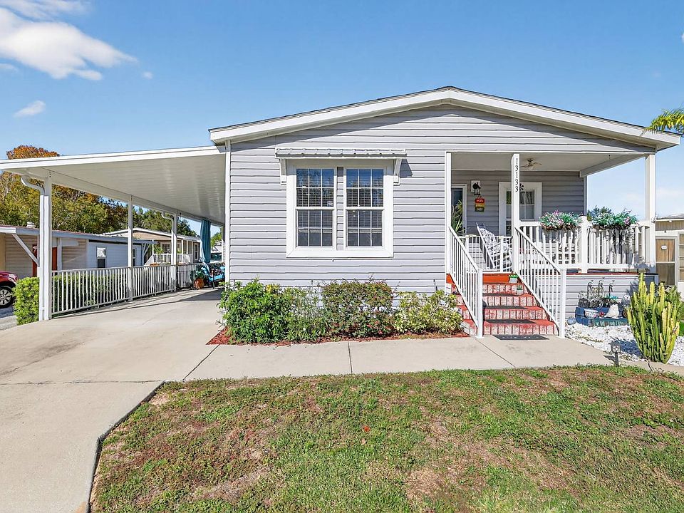 EXPERIENCE RETIREMENT AT GRAND ISLAND RESORT! Beautifully maintained three-bedroom, two-bath home featuring a welcoming front porch, crown molding throughout and a cozy living room with a fireplace. Enjoy luxuary vinyl floors, stylists stainless-steel farm sink and a custom made breakfast bar to enhance the spacious kitchen. Enjoy your morning coffee in the dinette or outside on the patio. You'll love the convenience of the indoor laundry and the roomy two-car carport. The primary suite offers a walk in shower, coffered ceilings and thoughtful creative designs in the master bath. Located on the sought after Chain of Lakes, near restaurants, shopping, medical facilities and the historic dowintown Mount Dora. Plenty of activities to keep you busy. Call to view your new home today!