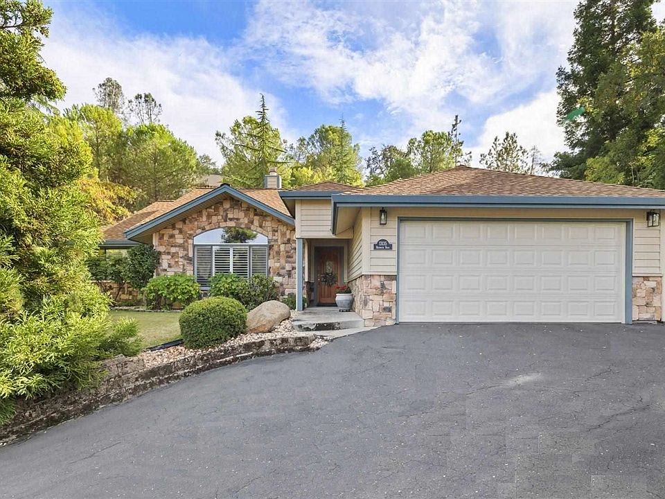 Quiet Elegance, Both Inside and Out. Tucked up off the road and hidden from view, this single-story home offers the most private setting. As you approach, you will appreciate the lush green landscaping, and rock accents. Inside, the entry's modern and stylish chandelier sets the tone for what is yet to come. The living room's high ceilings and large picture window give the room a spacious and bright feel while the rock surrounding the fireplace keeps it warm. The dining room opens to the kitchen and features a tray ceiling that perfectly frames the room's chandelier as if it were a piece of art. You will notice the kitchen's elegant design with the wood flooring, quartz counters, stainless-steel appliances and rich yet subtle cabinet color accented by glass doors. There is also a sliding glass door to the patio. On one side of the home is the master bedroom and attached bathroom featuring double sinks, a walk-in closet and both a shower and jetted tub. On the other side of the home are 2 more bedrooms, a full bathroom, and a laundry room. Outside, the thoughtfully designed yard is an absolute dream. Off the kitchen is a covered patio area perfect for enjoying your coffee or al fresco dining. The cover has 2 skylights making evenings viewing the stars or sitting out during