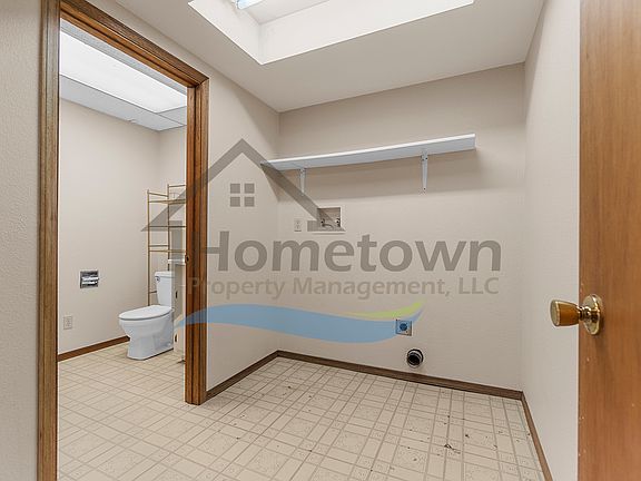 In a unique configuration, the laundry room is immediately adjacent to the guest bedroom on this level. Washer and dryer hookups are readily available for tenants to use. The guest bathroom on this level is a half bath with no tub or shower. This bathroom has a medicine cabinet and a sink vanity with cupboards.