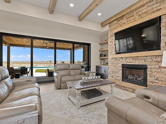 Nestled amidst the backdrop of mountain vistas and open spaces, this modern country home offers a design of sophistication and comfort, this property features: Stunning Open Floor, step into a spacious living area featuring a stone fireplace, intricate rock and wood beam details, creating a casual and inviting atmosphere. Gourmet Country Kitchen, the large kitchen boasts a substantial island, granite, stainless steel appliances, and a walk-in pantry with an additional storage & refrigerator. The separate dining area provides space for dinners and gatherings. Luxurious Primary Suite, the tranquility of the master suite, complete with a 5-piece bath featuring a spa like soaking tub, sauna/double walk-in shower & a spacious walk-in closet. Additional living spaces, with three bedrooms plus an office (easily convertible to a fourth bedroom) all featuring walk-in closets, this home is designed for comfort and privacy. Entertainment Haven, The basement is an entertainment zone complete with a large family room, a wet bar with hard surface countertops, a media/theater room, 5th bedroom & a bonus room, currently used as a gym and tumbling room, offers versatility. Outdoor Living, the property is beautifully landscaped with lush grass, trees, & rock arrangements. The in-ground pool features a walk-on security cover, & both the covered patio in the back and the inviting porch in the front provide stunning views and endless opportunities for relaxation and entertainment.