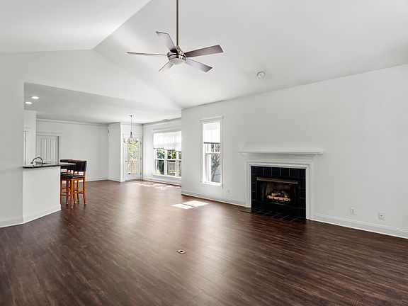 The open plan great room features a gas fireplace, large windows, and airy vaulted ceilings. The bright kitchen has a pantry, granite countertops including a breakfast bar, and a spacious open dining area. Kitchen appliances include the electric range, microwave, dishwasher, and refrigerator. A Dutch door in the kitchen opens to the laundry room with washer/ dryer hookups.