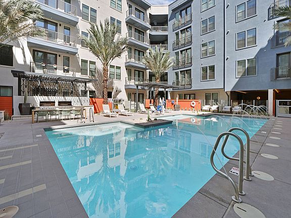 This floorplan features stainless steel appliances, a modern backsplash, and quartz countertops, which include an undermount sink in the kitchen. You will also enjoy private balconies, spacious walk-in closets, 6" baseboards, and wood-style flooring throughout with carpet in the closet and bedroom. Your home is complete with a full-size washer and dryer and door-to-door valet trash service for your convenience.
