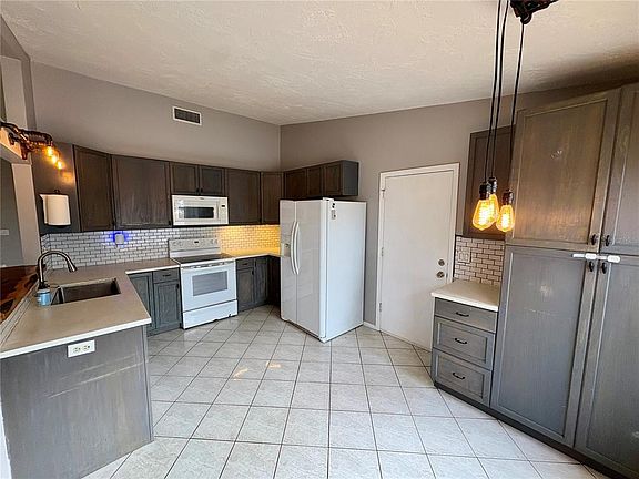 Stylish dark cabinetryBreakfast barAbundant natural lightMature treesVaulted ceilingsSubway tile backsplashFully fenced backyard