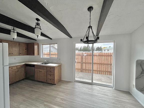 Exposed beamsBrand-new vinyl flooringNewly installed toiletBrand-new refrigeratorFenced-in backyardPeaceful cul-de-sacWarm wooden cabinetry