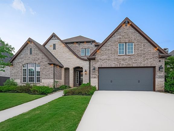 Step into luxury with this exquisite David Weekley home, featuring 4 bedrooms (2 DOWN), 5 bathrooms, a striking brick and stone elevation and a charming front porch with an 8-foot modern wood-and-glass door. Inside, an open foyer welcomes you with luxury flooring, an upgraded staircase, and a seamless, open-concept layout. The front of the home offers a private guest suite and a versatile study or flex room. The heart of the home boasts a gourmet kitchen with granite countertops, an oversized island with wood paneling, sleek white cabinets, SS built-in appliances, gas cooktop, and dazzling backsplash. The expansive family room showcases sliding glass doors to the covered patio and large backyard. The luxurious primary suite features a spa-like bath and Texas oversized walk-in shower. Upstairs includes a game room, media room, two spacious bedrooms with Jack-and-Jill bath, and a guest half bath. Remote shades, 3 car garage w/epoxy flooring & a sprinkler system complete this showstopper!
