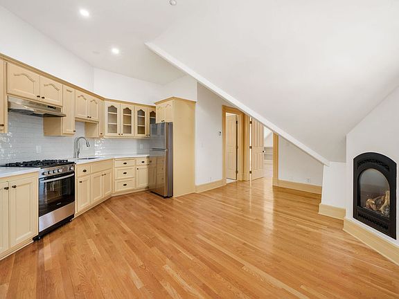 Gas burning stoveUpdated kitchen appliancesStainless steel fridgeOn site laundry roomLarge stained glass window