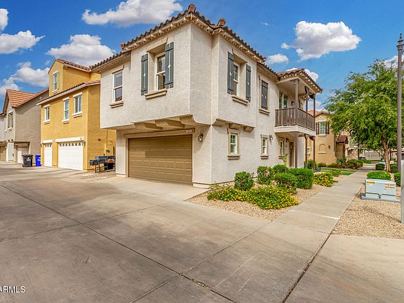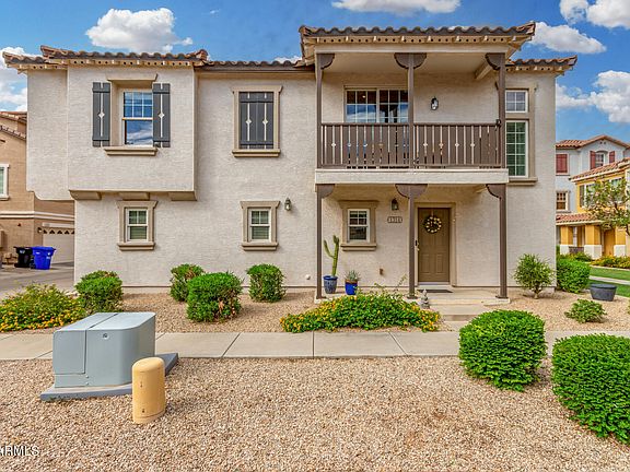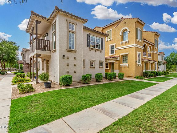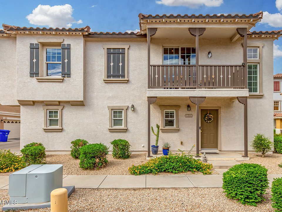DETACHED HOME WITH BALCONY & DOUBLE GARAGE THAT SIDES TO COMMON SPACE AND CLOSE TO THREE COMMUNITY POOLS. This residence has been gently occupied as a 2nd home. It shows beautifully and has been lovingly maintained. The main floor has garage access, a laundry room and also the Primary Bedroom with an Ensuite bathroom. Up the stairs to a bright open Great Room with an abundance of windows, and access to the covered balcony. Wood flooring & granite counters add to the elegant feel of this home. The kitchen has newer appliances and a large eating counter open to the Dining Area. The Living Room is very spacious. Down the hall is the 2nd bathroom and two bright good-sized bedrooms. The community boasts 3 pools (heated), numerous playground/park areas, ball courts and easy access to Loop 202.