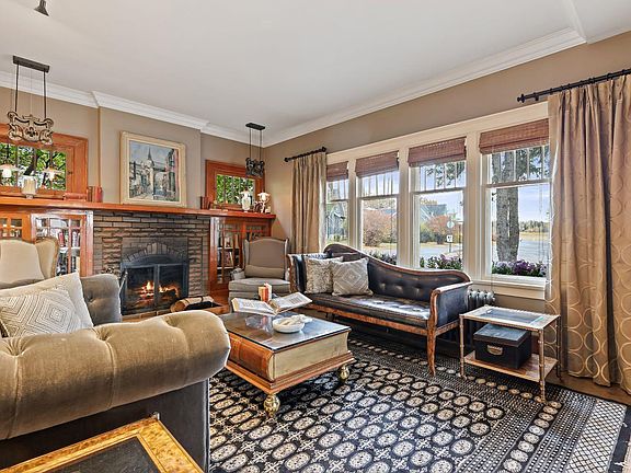 The central hall design leads to a spacious living room featuring built-in bookshelves, original piano windows, and a cozy wood-burning fireplace, alongside a formal dining room ideal for entertaining. The kitchen includes a butcher block island, honed granite countertops, stainless steel appliances, and a bright breakfast nook. The main floor also offers a versatile bedroom or den and a full bathroom.