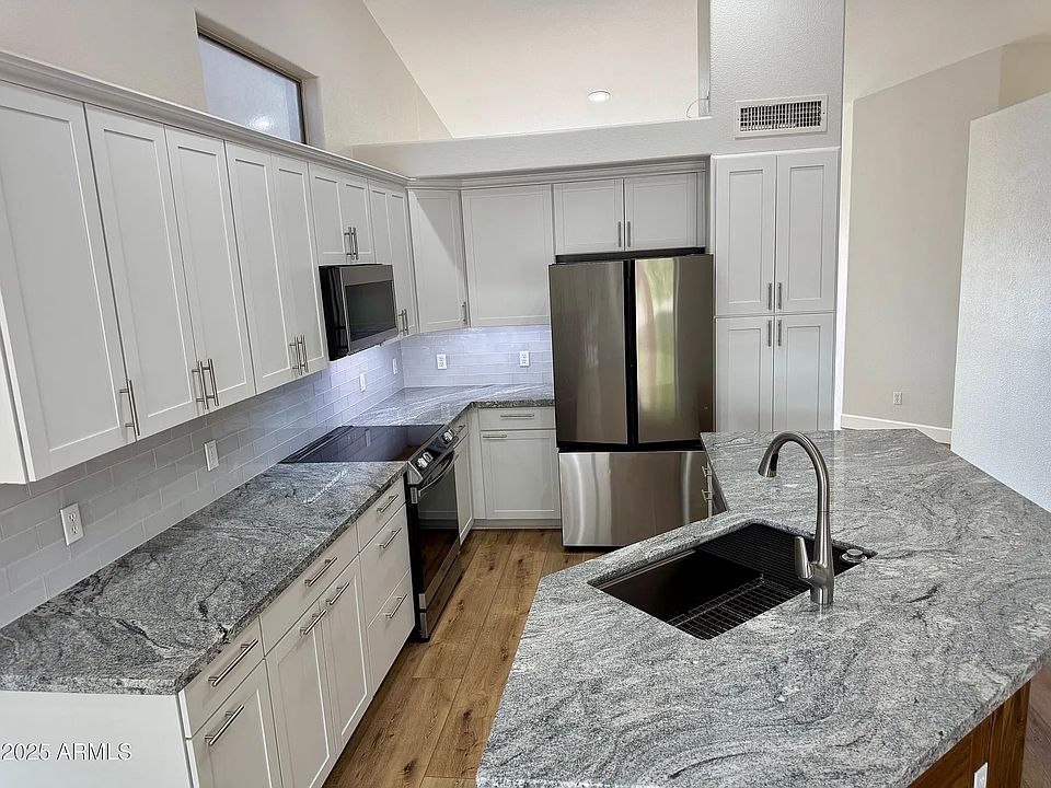 NEW kitchen cabinets, granite counters, luxury vinyl and tile flooring, sink, faucets, glass tile back-splash, high end SS appliances, lighting, door hardware, completely remodeled bathrooms w/luxury finish