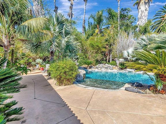 Nestled within a lush Tropical and Succulent Forest, this unique single-story Spanish Ranch-style with RV parking, home offers unparalleled privacy and tranquility, while still being conveniently located. As you approach, you'll be greeted by a stunning, custom-designed saltwater pool with two serene waterfalls and a gentle beach entry—a true centerpiece that sets the tone for the entire property. The interior of the home has been thoughtfully updated, with a completely remodeled kitchen just three years ago. Enjoy cooking and entertaining with top-of-the-line stainless steel appliances, custom Alder wood cabinetry, and elegant Italian porcelain tile flooring. Anderson sliders seamlessly connect the indoor and outdoor spaces, inviting you to step directly from the master bedroom into your personal poolside paradise. The master suite also boasts built-in closets and an oversized Kohler Birthday Clawfoot bathtub—an ideal retreat for relaxation. Situated on a half-acre of meticulously landscaped grounds, this property features over 30 varieties of clumping bamboo and a striking Canary Island Palm, offering complete seclusion. The landscaping not only enhances the beauty of the home but also ensures total privacy around the pool and throughout the property. Your own fruit orchard awaits, with mature trees including Naval oranges, Santa Rosa plums, Meyer lemons, miniature pink grapefruits, Alberta peaches, loquats, and kumquats—providing fresh produce right at your doorstep. Additional amenities include ample parking for up to six vehicles, secure fencing, and a hidden seasonal creek that adds to the charm and allure of this exceptional property. This rare gem in the Vista Foothills is more than just a home—it's a private retreat. Don't miss your chance to own this extraordinary property!
