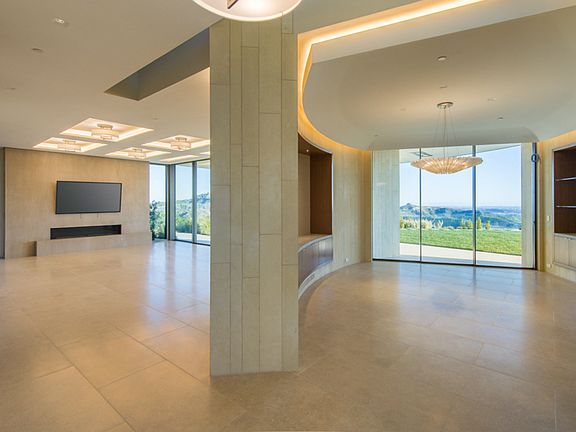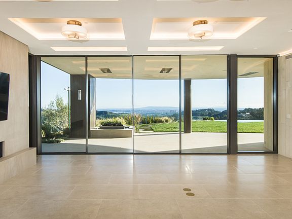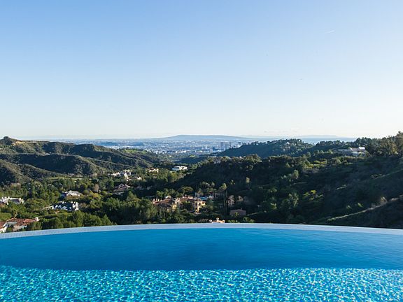 Situated up a private drive on a hilltop promontory, rests a brand new construction contemporary with spectacular views of the city, ocean and valley (wrap around views). Stunning features include 3 interior fireplaces, floor heaters throughout the house, a private spa on the master balcony, wine storage, a large theater, and a glass, 2-car garage convertible to an entertainment room. Other amenities include an infinity pool/spa, a heated outdoor patio with a fireplace and BBQ, and a motor court for 15 cars. 1+ year lease. Never been lived in.
