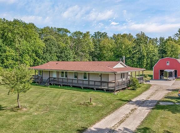 Gorgeous 3 Bedroom, 2 Bath Ranch set deep off a country road, nearly 17 "Ëœtruly wooded' acres (Hunting Shack stays!) w/ a 2-Car Heated Barn offers finished upper Attic with hardwood floor (ideal Hobby/Work space) plus a colossal Horse/Animal Barn with water & Pond. Stainless/Soft-Close mocha-tone Kitchen anchors the Open-Flow Family Room & Dining space with a striking floor to ceiling Stacked-Stone, Wood-Burning Corner Fireplace. Enjoy the quiet of nature on the Full Covered Wrap-Around Porch, a landscape of fruit trees and a place to till your garden. Freshly Painted in a crisp linen scheme with fawn Carpet and dark Hardwood floors. All major mechanicals installed the last five years! Includes a 1-Year America's Preferred Home Warranty!! Designed as a Split Ranch with Master En-Suite offering Walk-In Closet & updated Bathroom located privately opposite other Two Bedrooms & Common Full Bathroom. Whole House Vacuum System, large Laundry Room. Horse/Animal Barn Details: 4 windows, 2