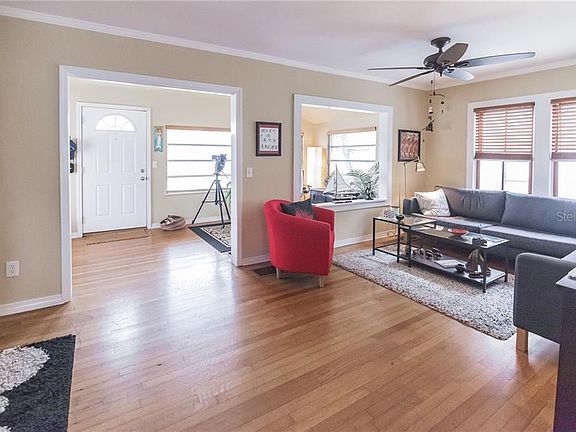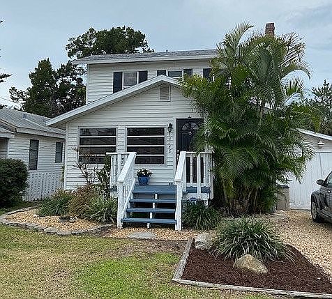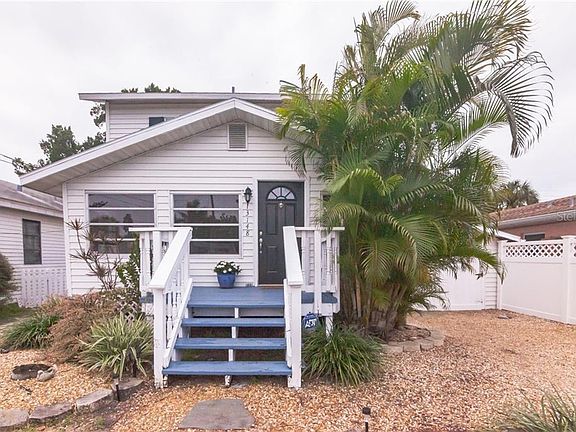 Completely furnished and turnkey 3 bd / 2 ba home only 2 blocks from the beach! Highlights include the remodeled baths, gourmet kitchen, and back deck! Pass the tropical landscaping on your way into the home, where you're met with wood floors, crown molding, and an abundance of natural light. The front room is perfect for an office and reading area and flows seamlessly into the living room, where you can entertain, or watch your favorite movie with the help of a built-in media center! Flow into the tiled eat-in kitchen, equipped with quartz countertops, stainless steel appliances, printed tile backsplash, double closet pantries, and a glass door to the deck. The features a large bathroom with a white vanity and deep soaking tub. A laundry room and storage area complete this level. Retreat to the upstairs to a primary bedroom, offering a private balcony and double closet. Two other bedrooms are on the front of the house in between the spa-like bath, containing a tiled walk-in shower with stone flooring and a half glass enclosure! In the backyard, relax on the spacious deck and paver patio, rinse off in the outdoor shower, and pick fruit from the mature Hawaiian banana trees! Central A/C and Forced Air heating. Alarm and sprinkler systems. One car garage with built-in storage and a workshop. Located near beaches, shopping, dining, and entertainment, with easy access to hwy 19 and St. Petersburg!