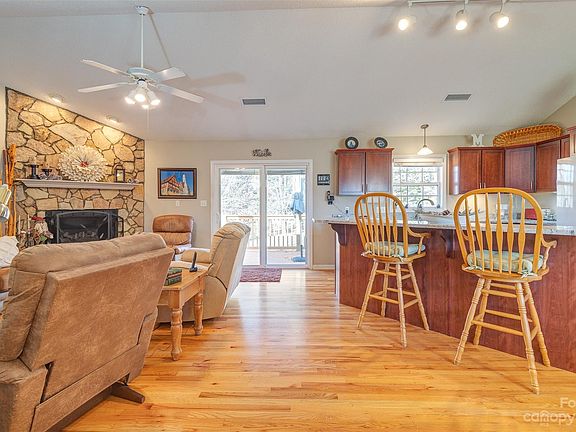 Ranch home in a pretty setting! Easy open entertaining from the kitchen to the living room and dining area which features are a kitchen island with a breakfast bar, cathedral ceilings, stone fireplace with gas logs, and a sliding glass door out to your large deck, along with nice hardwood floors. There is a primary ensuite with a walk in closet, large garden tub, tile flooring and a linen closet in the bathroom, which is so convenient. Two more bedrooms and another full bathroom make up the mostly one floor living area. The full walk out basement is unfinished, but some rooms are framed in, ready for your great ideas and more added living space. The property has a sprinkling of trees, level on one side and gently sloping on the other, fenced in back yard, an ashphalt driveway which is level to the publicly maintained street, attached garage, and a cute covered porch.