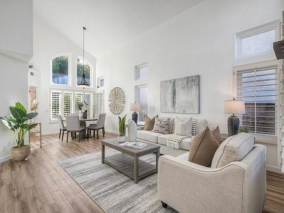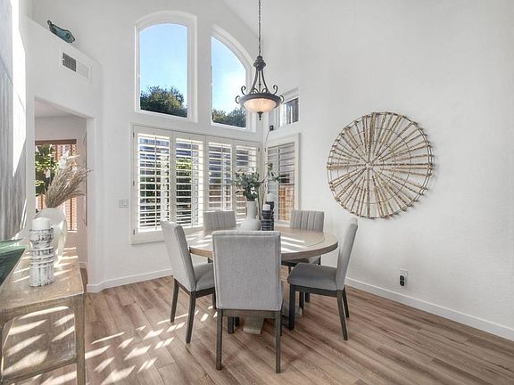 Welcome to this beautifully upgraded home in the desirable Bel Canto community of Rancho Del Oro, where pride of ownership truly shines. This light and bright open floorplan features vaulted ceilings, plantation shutters, newer windows, OWNED solar and an abundance of natural light throughout. The spacious kitchen with gorgeous quartz countertops, premium stainless-steel appliances and an abundance of storage seamlessly flow into the family room, creating an ideal space for entertaining or relaxing at home. The oversized primary suite offers an extended area for peaceful retreats with high ceilings and a spa-inspired ensuite bath with walk-in closet. Step outside to your private resort-style backyard, designed for year-round enjoyment. The custom hardscape with multiple areas for entertaining, built-in BBQ, and tranquil waterfall feature set the perfect stage for outdoor gatherings and quiet moments alike. Enjoy cozy evenings by your outdoor fireplace and feel the extension of the outdoor living. Additional highlights include owned solar and central AC ensuring energy efficiency and savings, as well as an attached 2-car garage and low HOA dues. Situated in a quiet, well-maintained neighborhood close to top-rated schools, parks, and shopping, this home offers both comfort and convenience with timeless appeal. Experience the best of coastal North County living—schedule your showing today!