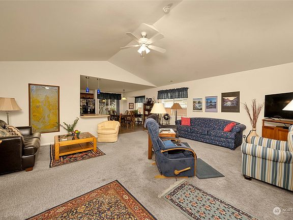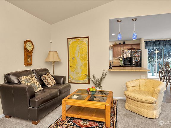 Beautiful and scenic Orting living awaits you in this lovely 3 bed, 2 bath rambler located in sought after Rivers Edge Community! The large living room featuring new lush carpet & vaulted ceilings which flows into the open concept kitchen giving you plenty of room for entertaining, lots of cabinet space & a separate dining area. Down the hall you will find the primary bedroom offers a walk in closet, his and her sinks and plenty of natural light. Two additional bedrooms, hall bath and large laundry room complete this home. Enjoy hot summers inside with your central air! Walking distance into town, river for salmon fishing, golf course within 1 mile & community park just around the corner! Meticulously maintained home by original owners.