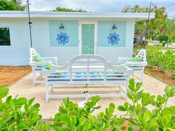 The sundrenched Dining room features an original vintage Tommy Bahama dining set with ample seating for six. The side door opens to a lovely patio with solar lighting and a seating area to enjoy for days or nights. Surrounded by brand new landscaping, this is a private little oasis!