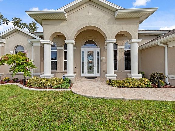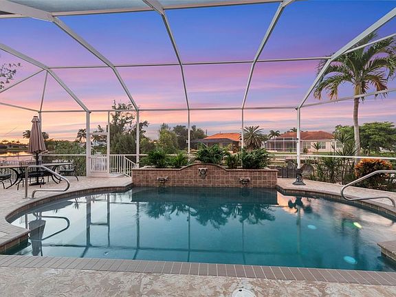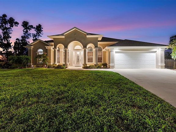 Welcome to luxurious waterfront living with stunning water views from nearly every room.No Flood Insurance Required. A spacious foyer leads to a large great room, featuring ceramic tile. Sliding glass pocket doors open up to embrace the Florida lifestyle right from your living room. The kitchen is perfect for entertaining, with a central island, ample cabinet and storage space, modern appliances, and a pantry. There’s an indoor laundry area with a washer and dryer, plus a double-size laundry sink in the garage. The bedrooms follow a split plan, with two additional rooms that can serve as bedrooms or an office. The primary bedroom is incredibly spacious, offering water views, wood floors, and access to a spa-like bathroom with a large Jacuzzi tub, separate shower, and plenty of linen and closet space. It also opens onto the lanai. The other bedrooms are roomy, and a guest bathroom with a shower completes this side of the home. Step outside to the Florida-style patio with ample seating, a shaded lanai area, and plenty of space for sunbathing. The heated waterfall pool is perfect for relaxation, offering spectacular sunset views over a wide canal and lake. For your protection there are hurricane screen shutters along the back lanai and shutters for most all the other windows. The garage door is hurricane rated too. This home boasts over 2,300 sq. ft. of living space, with water, sewer, and irrigation in place. The roof was redone in 2022, and the AC and water heater have been recently updated.
