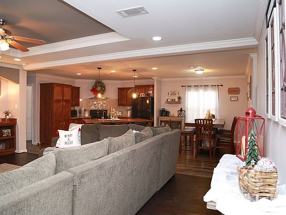 This newly built 3 bdrm 2 bath features an open-concept floor plan w/1680 sqft. This spacious kitchen has a large island w/seating, lots of cabinets, gorgeous glass vent-a-hood & the seller is leaving all kitchen appliances. Living room features eye-catching tray ceilings, built-ins & home has new flooring. There is a large metal covering for up to 5 cars or could be an outdoor entertaining area.