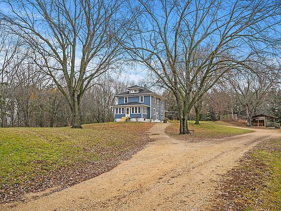 Charming 1910 farmhouse with 3 beds up, featuring a primary bedroom with a walk-in closet and private deck. The remodeled kitchen boasts soft-close cabinets, under-cabinet lighting, and stainless appliances. Hardwood floors, crown molding, and period architectural details grace the main floor. Enjoy the 4-season tiled porch and finished lower level with egress windows, providing ample light. The lower level includes a 5th bedroom, game/family room with a bar area. The 7-acre lot is an outdoor haven with a picnic area, fire pit, and numerous fruit trees. Storage building with a new concrete floor offers practical space. Explore the possibilities with a new 25X50 concrete pad, Perfect for a hobby farm or business owner needing equipment storage. This home is a unique blend of historic charm and modern amenities, offering a tranquil retreat on a spacious lot. septic is compliant and home inspection is complete. Garage and barn to be removed soon.