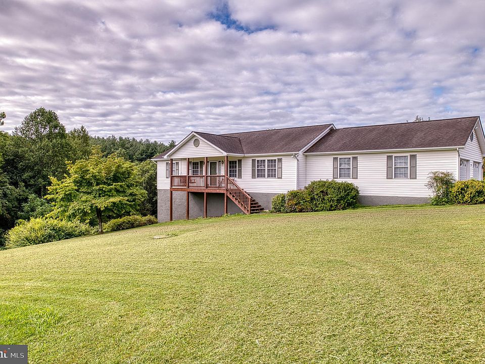 Welcome to your perfect country retreat! This charming 3BR/2BA rambler offers the ease of one-level living, nestled on just under 4 private, scenic acres with gorgeous farm and mountain views. Step inside to an open and inviting floor plan filled with natural light. The spacious kitchen features abundant cabinetry, generous counter space, a pantry for extra storage, and easy access to the main-level laundry. A formal dining room provides the perfect spot for holiday gatherings or casual family meals. The large living room, anchored by a cozy gas fireplace, is ideal for entertaining or enjoying quiet evenings at home. Gleaming hardwood floors flow throughout the main living area, adding warmth and charm. The split bedroom design ensures privacy, with a comfortable primary suite featuring a walk-in shower, and two additional bedrooms with a full bath nearby. The full unfinished walkout basement, complete with a plumbing rough-in, offers endless possibilities—extra bedrooms, a recreation space, or even an in-law suite. Outdoor living is just as enjoyable here. Relax with your morning coffee on the front porch swing while soaking in the peaceful country views, host summer cookouts on the rear deck, or unwind on the covered patio. A ramp from the driveway makes the home handicapped accessible, and the oversized 2-car garage provides plenty of space for vehicles, storage, or hobbies. Bring your animals! Tons of wide open property for your horses, goats and chickens. Bring your mini homestead. With a paved private driveway, no HOA, and no restrictions, this property offers both freedom and convenience. Just move in and start enjoying the serene lifestyle you’ve been dreaming of!