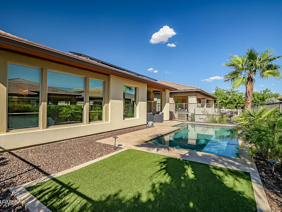 Why wait for a new build when you can step right into this warm and welcoming home in Trilogy at Vistancia? Built in 2016, it already has that lived-in comfort with hand-scraped bamboo floors and sleek, wood-look tile that's easy to care for. The kitchen is set up for anyone who loves to cook or hang out—a huge island, quartz counters, and custom backsplash make it feel special but practical. There's even a flexible space that works great as an office or hobby room. The whole house has fresh, modern touches like updated lighting and ceiling fans to keep things feeling bright and comfortable. Outside, your own private getaway awaits—a pool with travertine decking and a cozy gas fireplace where you'll love relaxing under the stars. The garage isn't just for cars; it's got built-in cabinets, an EV charging station, and extra insulation so you stay energy smart. With owned solar panels and a high-efficiency AC system, this place runs as smart as it looks.